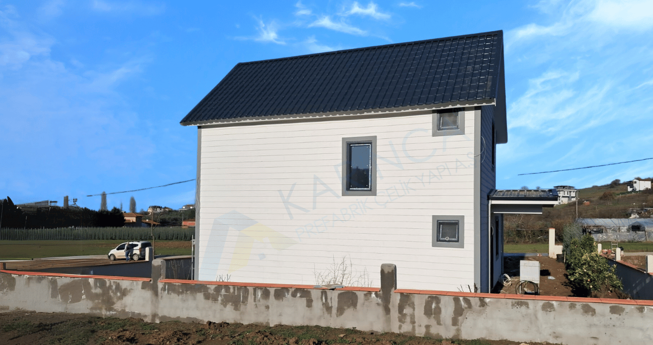 Karınca Prefabrik olarak tamamladığımız 120 m² hafif çelik villa projesi, modern tasarımı ve üstün deprem güvenliğiyle prefabrik yapı teknolojisinin en başarılı örneklerinden biridir.